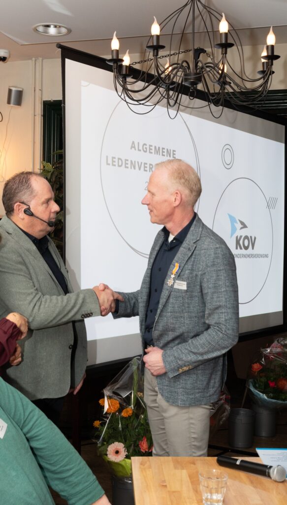 Een bijzonder moment was het afscheid van Dirk Botermans als bestuurslid na zijn bijna 23 jaar betrokkenheid bij onze ondernemersvereniging. Naast de Koninklijke onderscheiding die hij een dag ervoor uit handen van burgemeester Visser had ontvangen, werd hij deze avond ook benoemd tot erelid van de KOV. De lange, staande ovatie van de leden als dank aan hem sprak boekdelen.